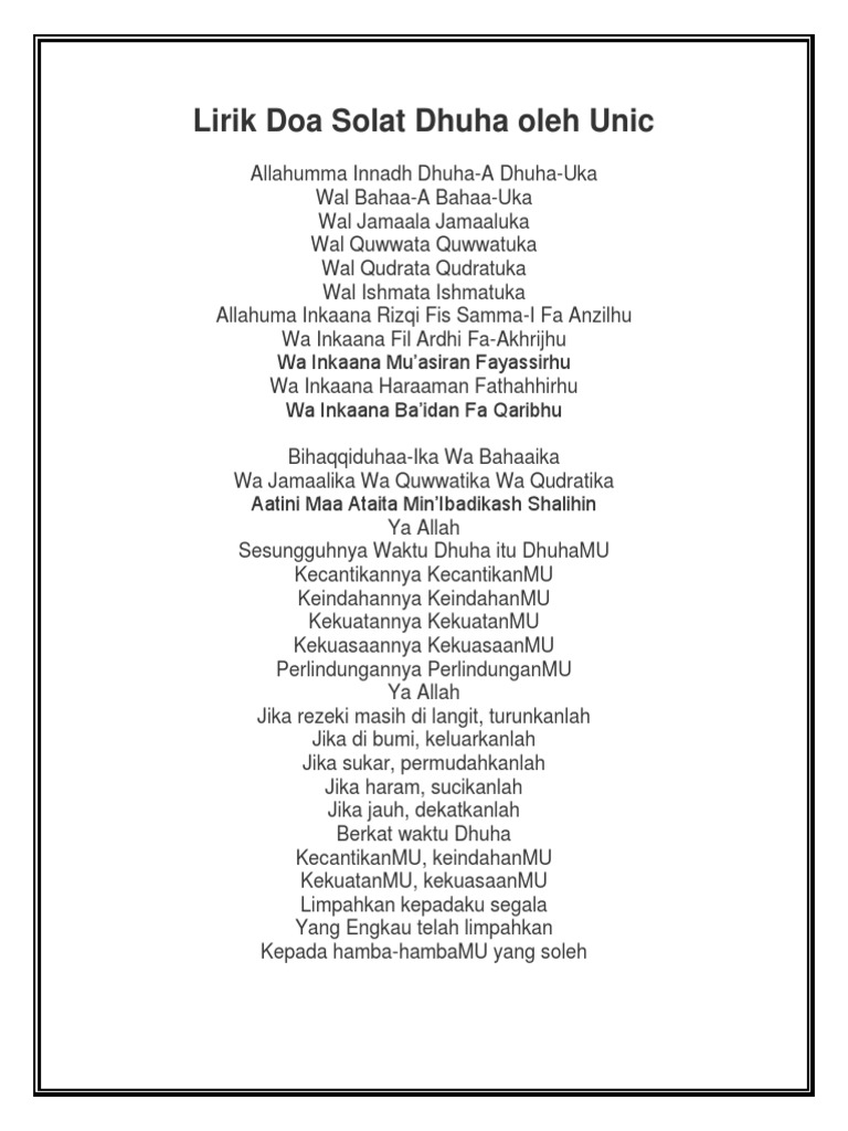 Download Lirik Lagu Doa Dhuha. Play Doa Dhuha Song by Unic from the Malay album Nasyid Nasyid Viral Kompilasi Terbaik Unicdotmy Pro. Merdu Doa Sholat Dhuha Liric - Unic Audio Media Dakwah by.